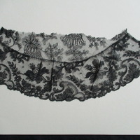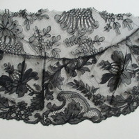 - Semi-circular piece of black lace netting. Both side edge hemmed. Tope edge raw/unfinished. Border to lower edge. Bottom edge border heavily decorated with large and small flowers and leaves. Appears to have been removed from an item of clothing.