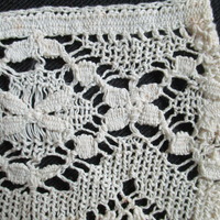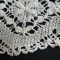 - Piece of heavy cotton lace edging. Cream colour. Flower/diamond design. Piece has a scalloped edge at the bottom and straight edge to top. Hemmed on one side.