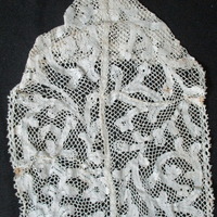 - Piece of cream cotton lace with large swirling paisley and leaf design with 0.5cm band through the middle. Circular edging to long sides. Piece is pointed to on side (possibly cut from a sash).