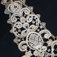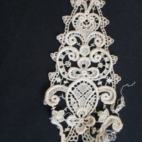 - Four triangular pieces of silk lace decoration. Light brown/beige colour. Each has the same design of flowers and swirls.