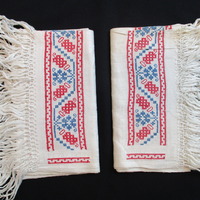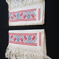 - Two damask towels embroidered at each short edge with a flowing red and blue cross-stitched design on off-white background. 10 cm fringing to both short edges.