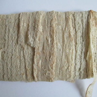 Unused length of lace trim/ribbon wound round paper.: Length of unused cream lace ribbon wound round paper.(ii)