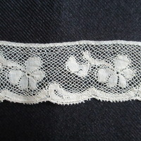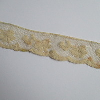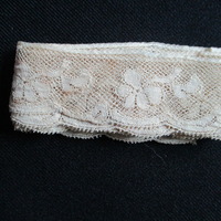 - Length of cream silk lace trim/edging. Netting design decorated with silk thread edges and flower, stem and leaf pattern to centre. One long edge is scalloped.