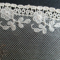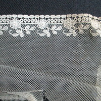 Piece of decorated nylon netting.: End detail of decorated cream netting. (ii)
