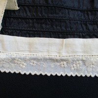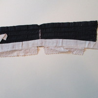 - Black silk collar with 4 stiffening cords running horizontally with vertical tortoiseshell stiffening banc to centre. Cream cotton lace piece attached to lower edge with a flower design and scalloped edge. Two black silk sashes/ties attached to one end of the collar which hang down the back. The silk ties are shaped to a point. Small buttonhole on collar where the ties are attached. 2 sets of hools and eyes to edge of collar.