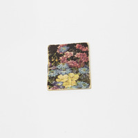 Tapestry fabric Handbag with a curved wooden handle with wooden clasp, lined interior with pocket. With four accompanying items: 2018.9.6.13 - Pair of spectacles (broken). 2018.9.6.12.4 Possibly tortoiseshell frames. Metal arms.