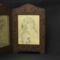 - Hand made and hand decorated wooden hinged double picture frame. Contains two pencil sketches of a boy (with the letter K underneath on the frame) and a little girl (with the letter S underneath on the frame) who are possibly Isabel and Lawrence Salt.