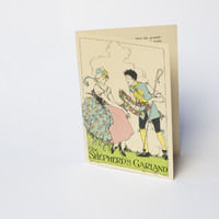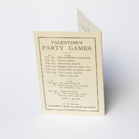 - The Shepherd's Garden.' Cardboard box, slightly damaged, 16cm high x 11cm wide, containing 8 cards. Box and cards with coloured picture of shepherd presenting floral wreath to shepherdess. Inside of card contains riddling poem with missing words. Separate sheet listing answers to riddles. Made by Valentine and Sons, Dundee and London. Also contains two handwritten cards 11cm high x 9cm wide with instructions to games, 'Find Me!' and 'Hide and Seek' with blank paper folded round them. Back of cards contain printed advertisement for 'White Elephant' stall for Oxted and Limpsfield Congregational Church. C1915.