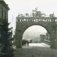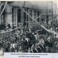 - Photograph of the arrival of Princess Beatrice for the opening of Shipley Art and Technical College. The mount card has a typed label 'Official opening of the Shipley Art and Techinical Institute in 1887, Sir George Chubb (Chubb safes) presented the key which he handed to Mrs Titus Salt (Dauguter-in-law of Sir Tutus) who in turn handed it to HRH Princes Beatrice who then performed the opening ceremony'.