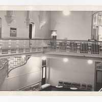 - Two black and white photographs (16.7cmx12.1cm) showing the main hall of Exhibition Road building showing the balcony. Marked 'A.Anderson' on reverse.