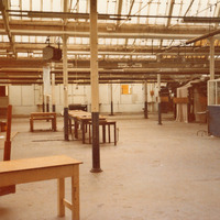- Colour photograph taken after the mill had closed odwn. It shows an empty room with columns and tables. A blue coloured wall is to the right of the photograph.