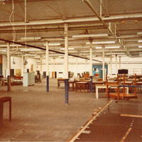 - Colour photograph taken after the mill had closed down. It shows a number of tables gathered together at the rear of the room. A white coloured table is in front of the group with an upside down brown table in the front of that.