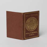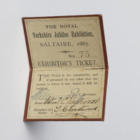 - Ticket for the Royal Yorkshire Jubilee Exhibition. Red coloured book cloth cover with gold detailed saltaire crest and the words 'Exhibitor. Saltaire 1887.' The bottom of the inside of the ticket includes the signature of the secretary, name of the holder, and a signature of the holder.
