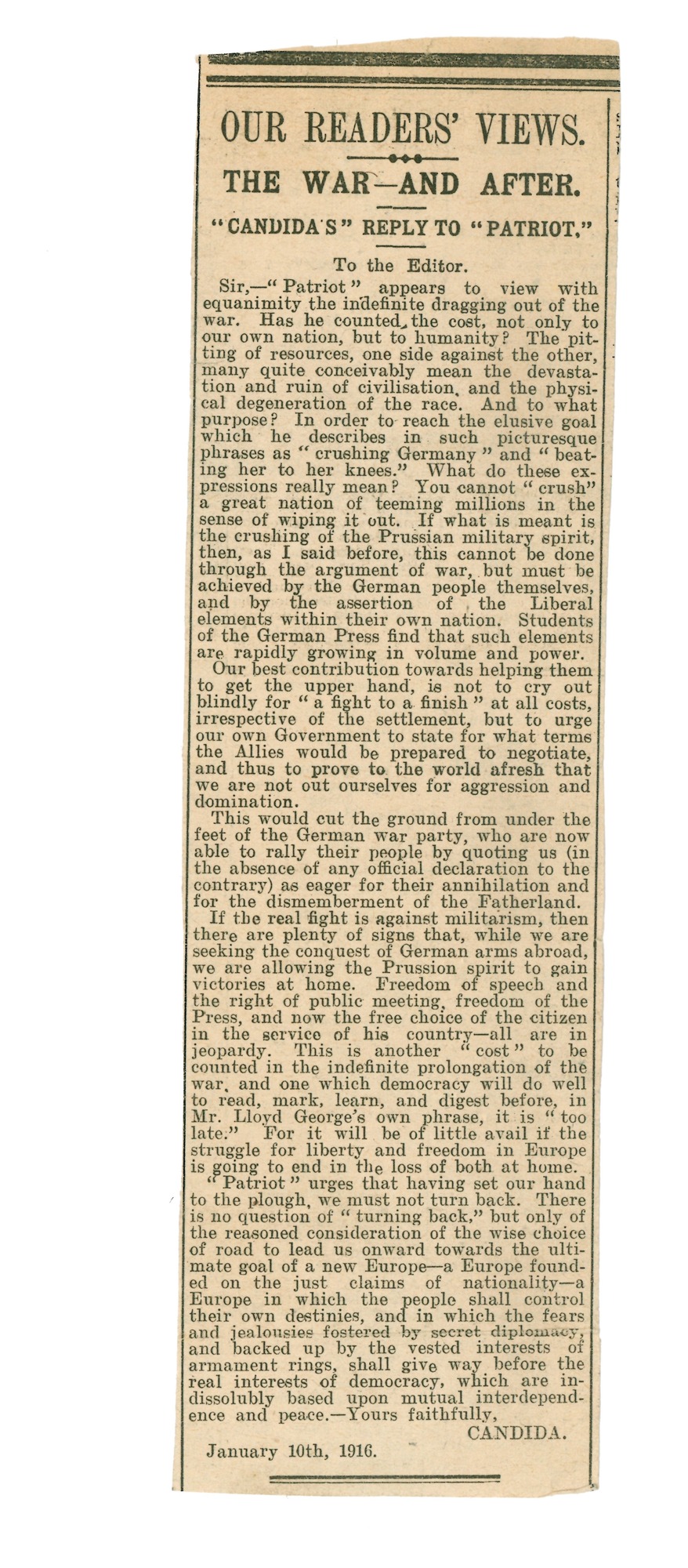 Loose news cuttings, 1916-1918: The War and After - Candida reply to Patriot
