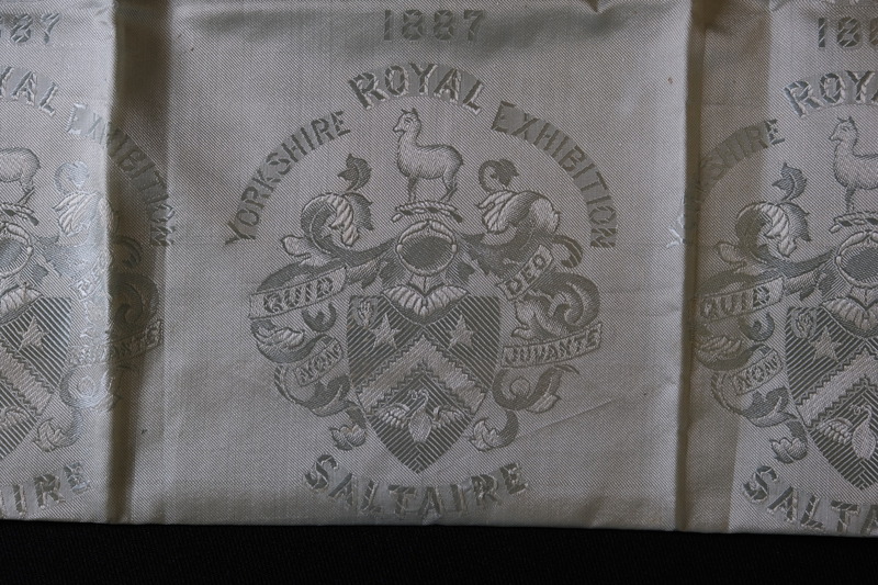 Royal Yorkshire Exhibition 'Saltaire 1887' silk scarf: Close up of one panel of the scarf