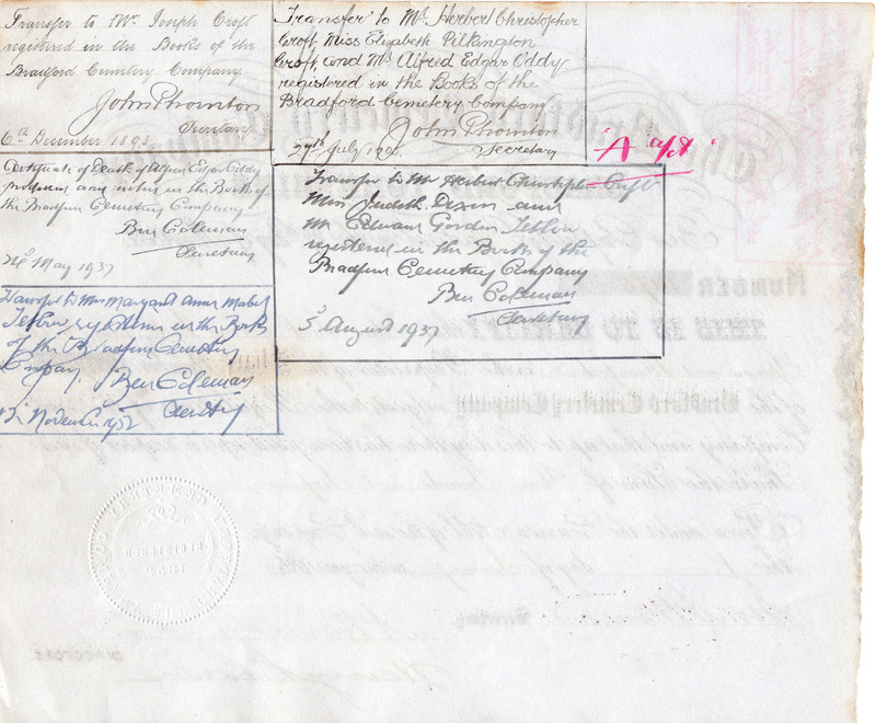 - Share certificate of the Bradford Cemetery Company: Back of certificate
