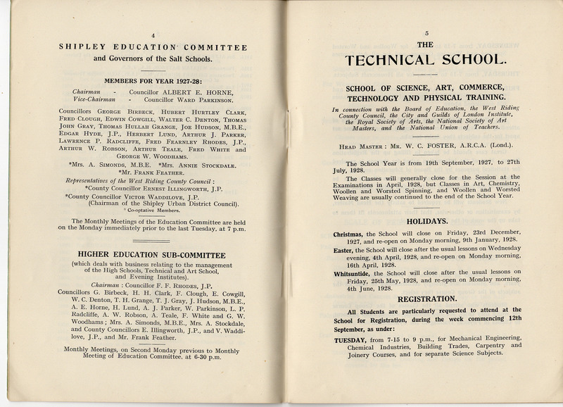 - Salt School's Technical School Prospectuses (1927-1940): Prospectus 1927-1928 - pages 4 and 5