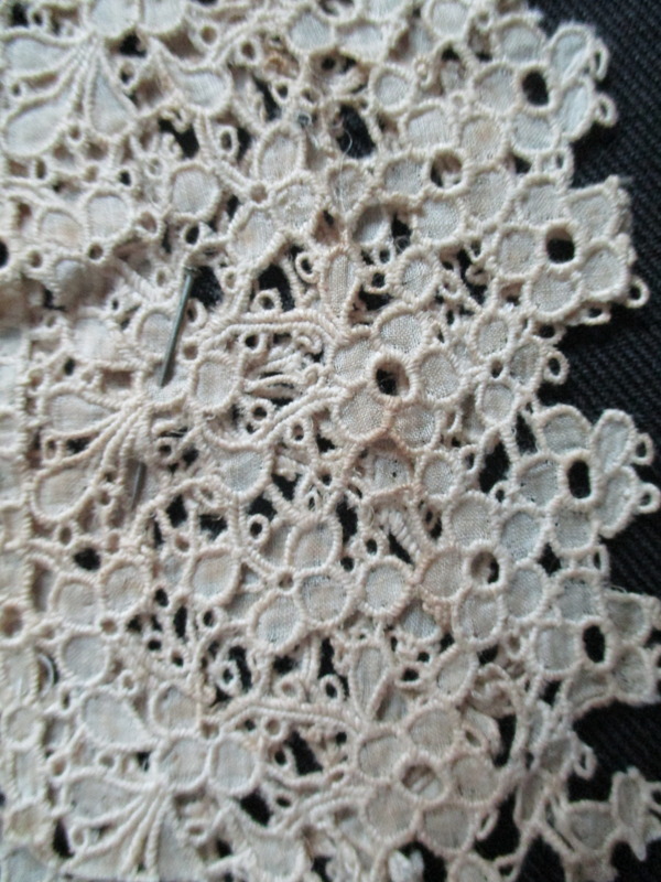 2 pieces of silk lace.: Cream silk lace with steel pin.