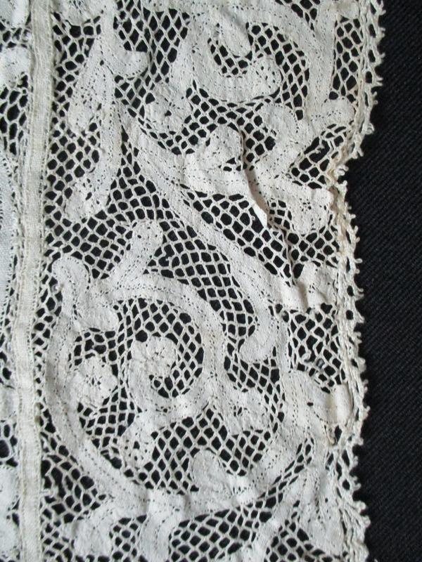 - Piece of cream cotton lace.: Detail of swirl design on cream lace.