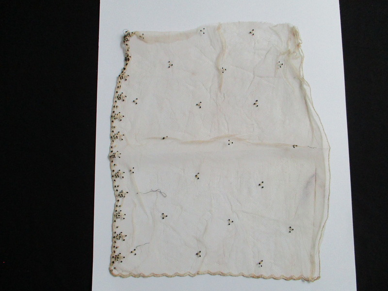 - Piece of decorated cream netting.: Piece of cream nylon netting.