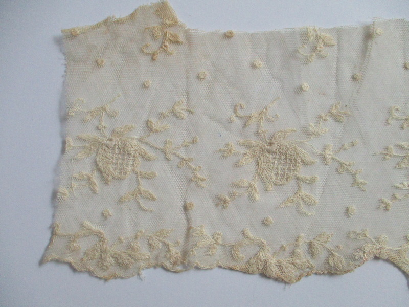 Piece of cream silk embroidered netting.: Close up of lace netting showing embroidered design. (iii0