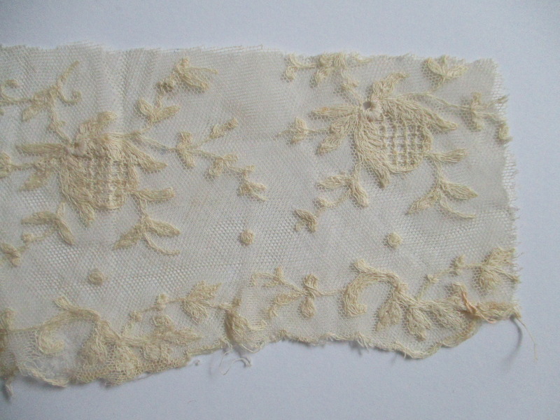 Piece of cream silk embroidered netting.: Close up of lace netting showing embroidered design. (iv)