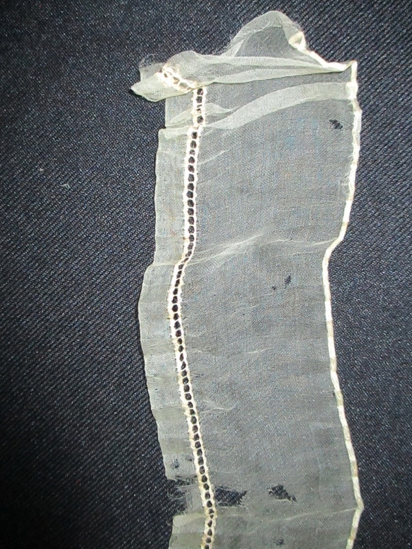 - Piece of cream silk edging/trim.: Close-up of cream silk ribbon/edging. (i)