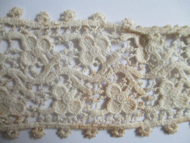 - Five pieces of silk lace trim.: Closeup of silk lace ribbon. (ii)