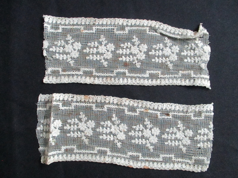 Two pieces of decorated cream netting.: Two pieces of cream lace ribbon. (ii)