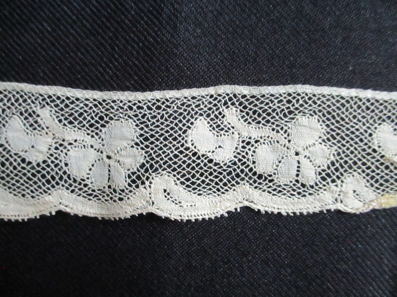 Length of folded silk lace trim.: Design detail on folded cream silk lace trim.