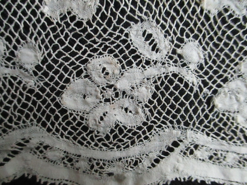 Three pieces of cream silk lace trim.: Close-up image of design detail on cream silk lace trim. (i)