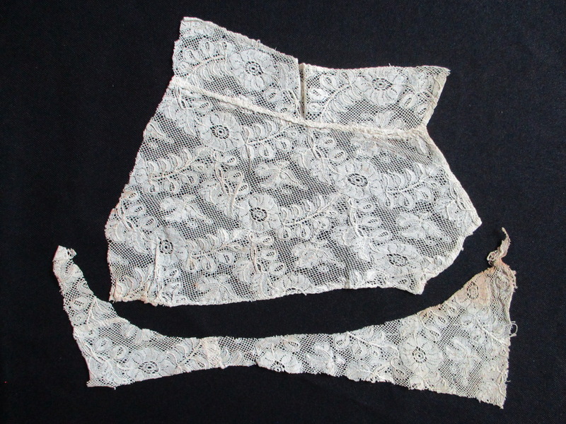- Two pieces of cream silk lace.: Two pieces of cream silk lace cut from collar/bib. (i)