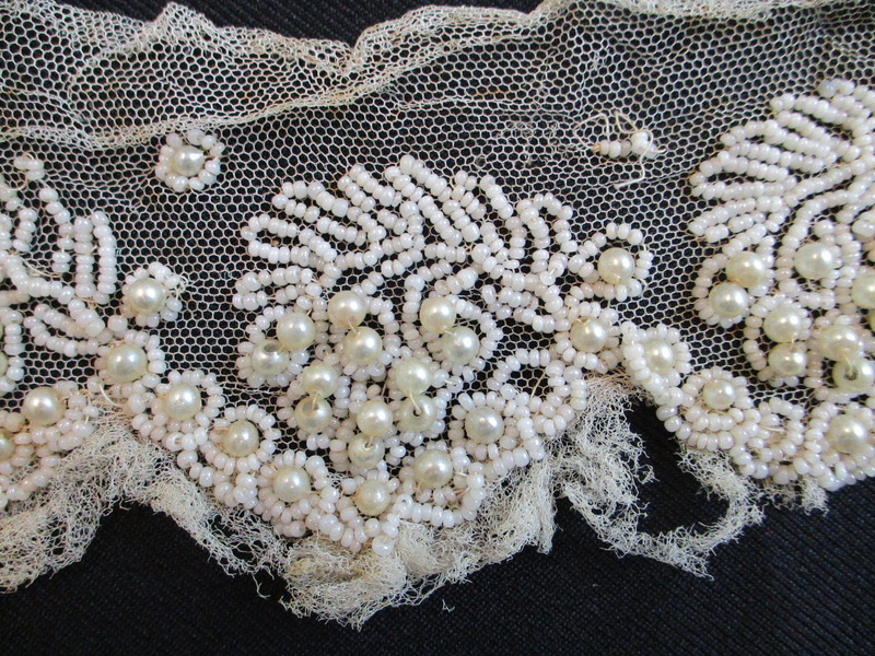 - Strips of heavily beaded cream netting: Beading detail on cream netting. (iv)