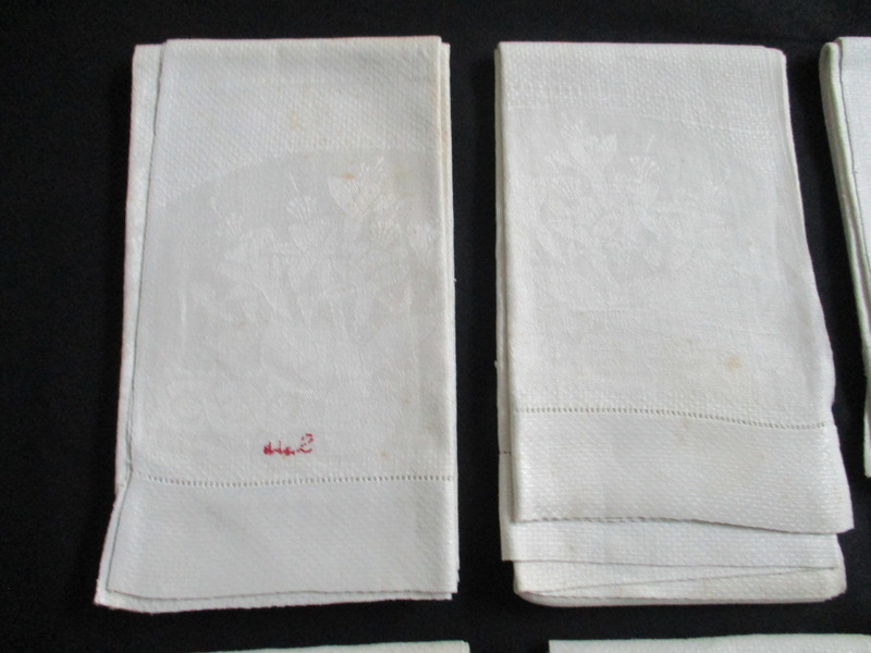 Seven cream damask towels.: Two towels, rear view, one showing reverse of Salt monogram