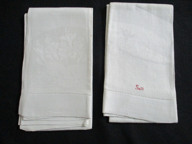 Seven cream damask towels.: Two towels, front view, one showing Salt monogram