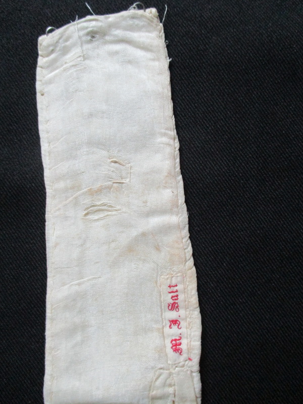 Lace Collar: Close up of owners name tag on silk collar interface.