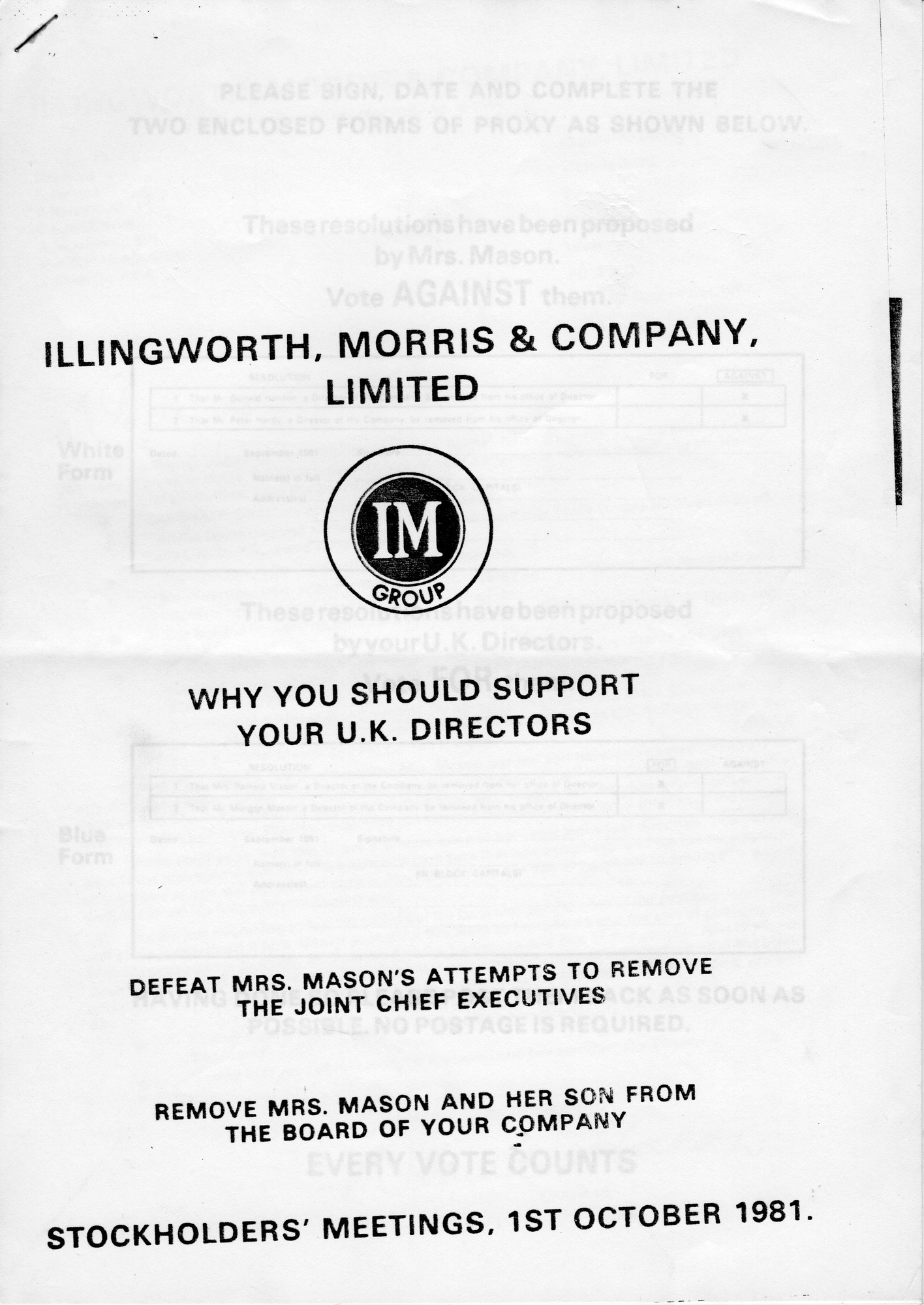- Papers from a Illingworth, Morris stockholders meeting over Mrs Mason's complaints: Cover page