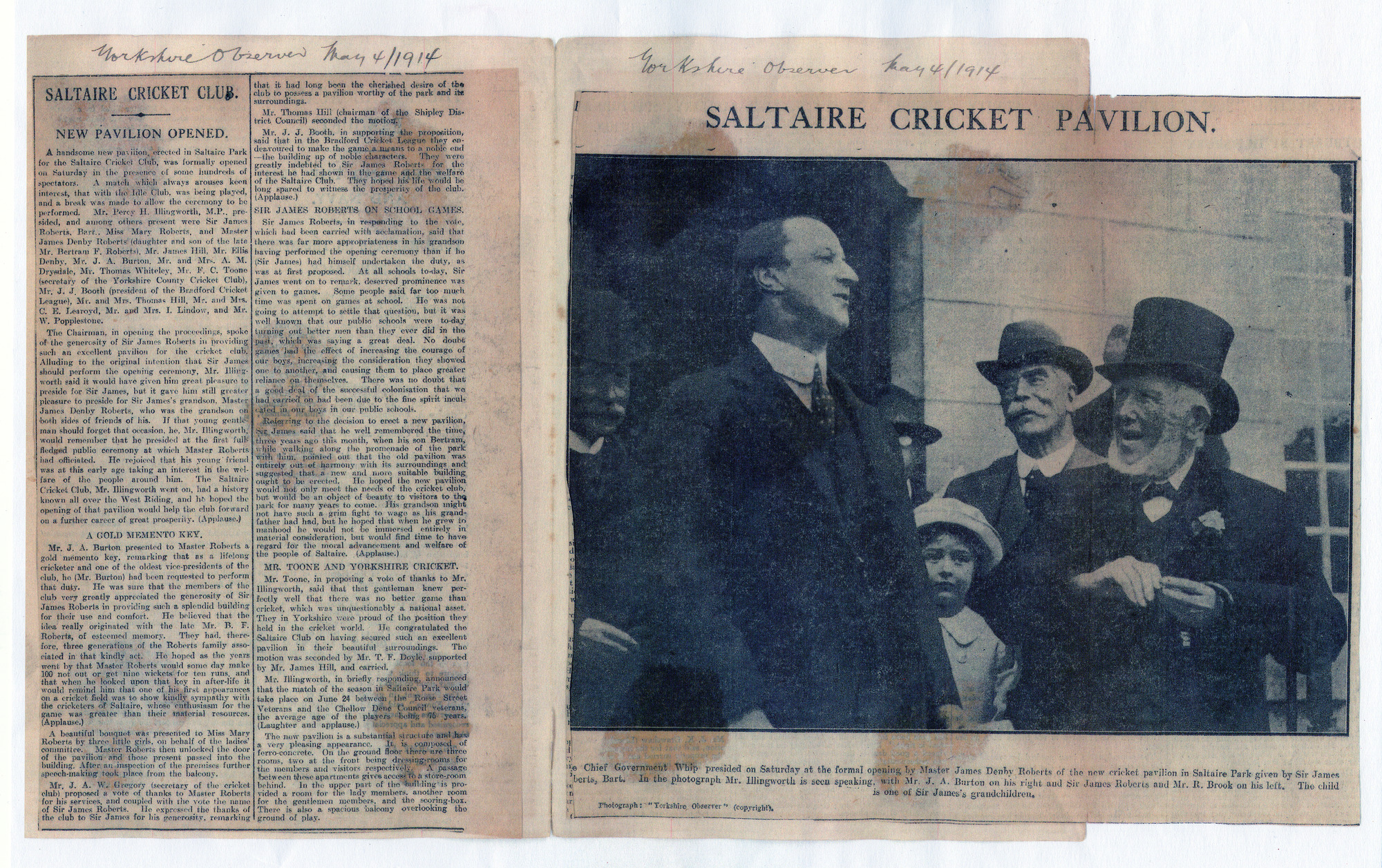 - James Denby Roberts opened New Cricket Pavilion given by Sir James Roberts