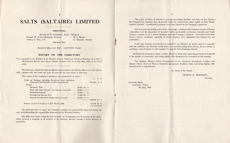 - Salts (Saltaire) Ltd Directors Report and Statement of Accounts : 31st March 1931: Pages 2-3