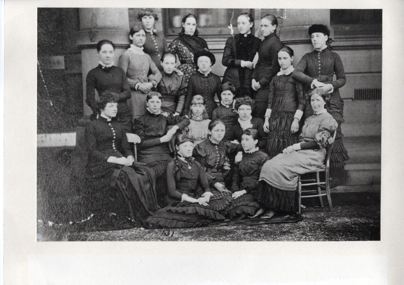 - Girl students outside front of the Salts High School building on Victoria Road, Saltaire.