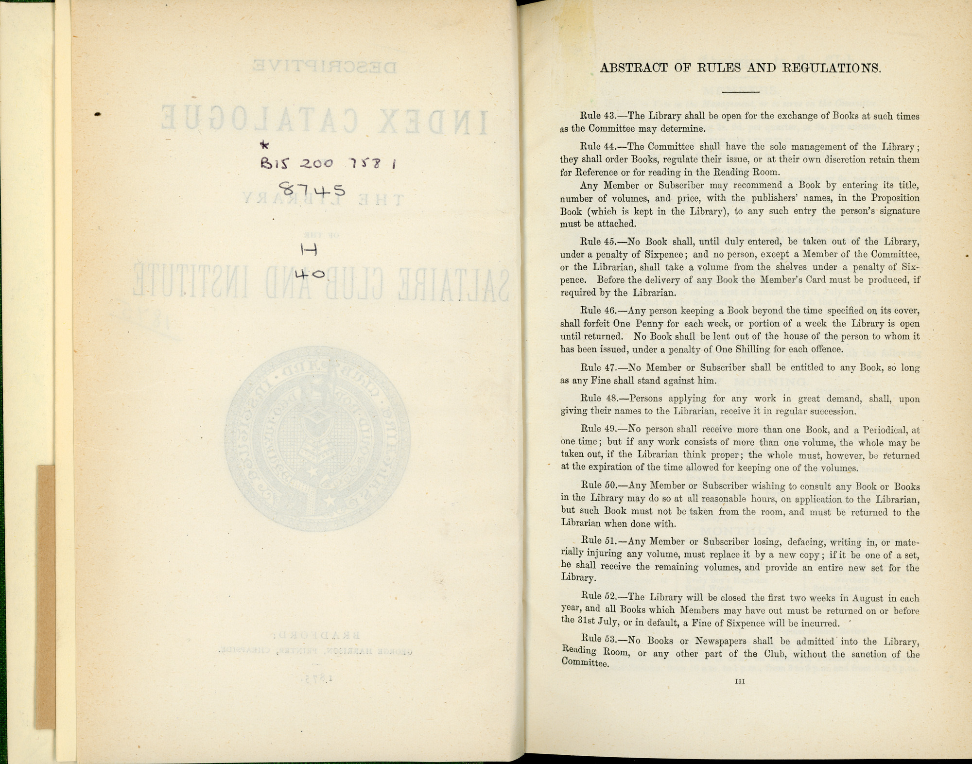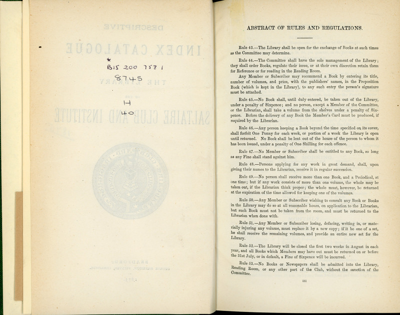 Descriptive Index Catalogue of the Library of the Saltaire Club and Institute: Pages 2 and 3