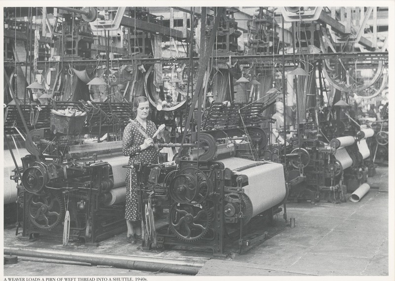 A weaver loads a pirn of weft thread into a shuttle, 1940s