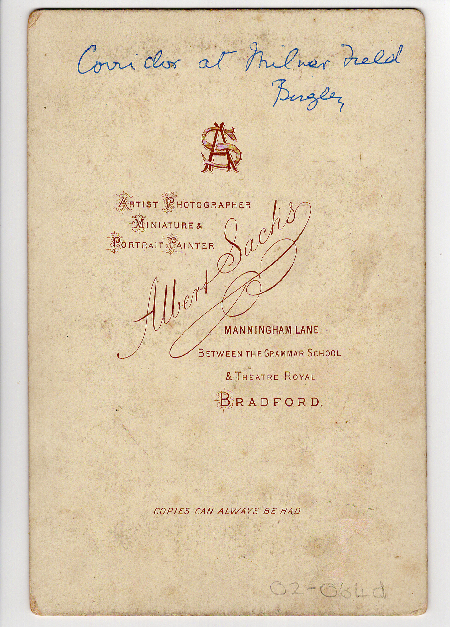 Conservatory at Milner Field: Rear of photograph