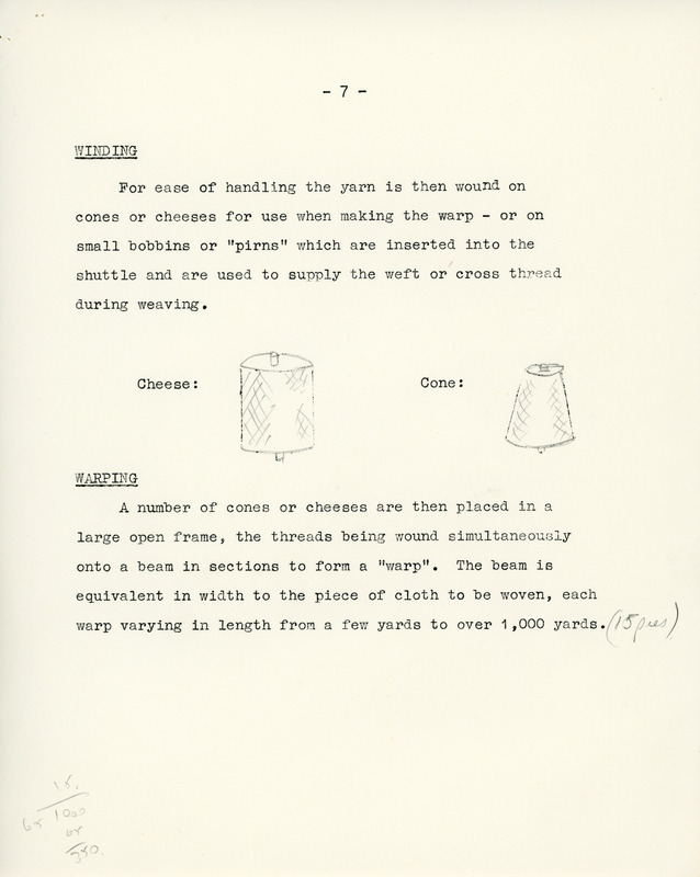 A number of cones or cheeses are then placed in a large open frame, the threads being wound simultaneously onto a beam in sections to form a "warp". The beam is equivalent in width to the piece of cloth to be woven, each warp varying in length from a few yards to over 1,000 yards.