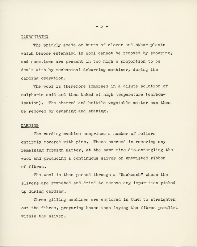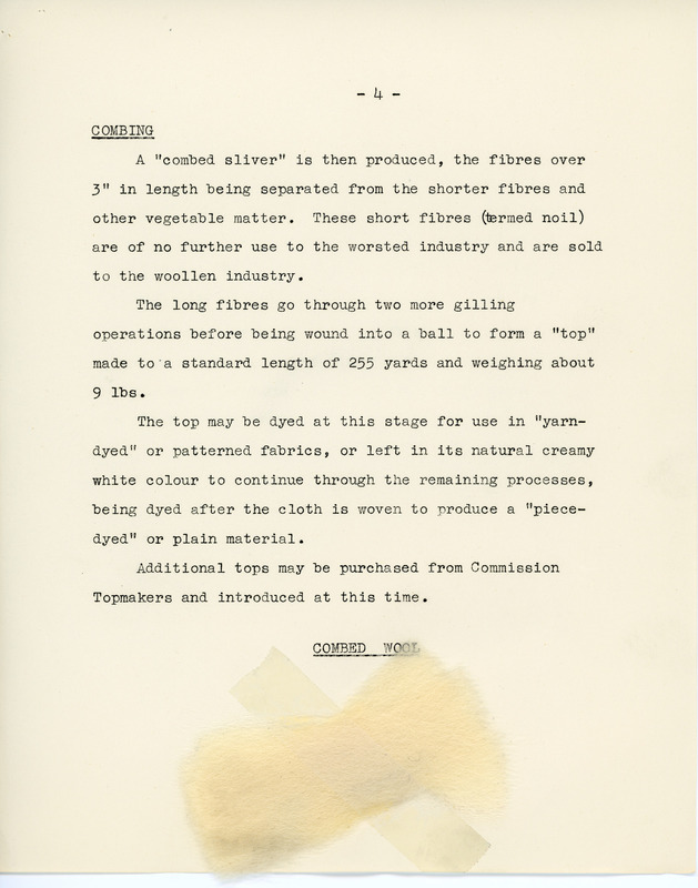 A "combed sliver" is then produced, the fibres over 3" in length being separated from the shorter fibres and other vegetable matter. These short fibres (termed noil) are of no further use to the worsted industry and are sold to the woollen industry.