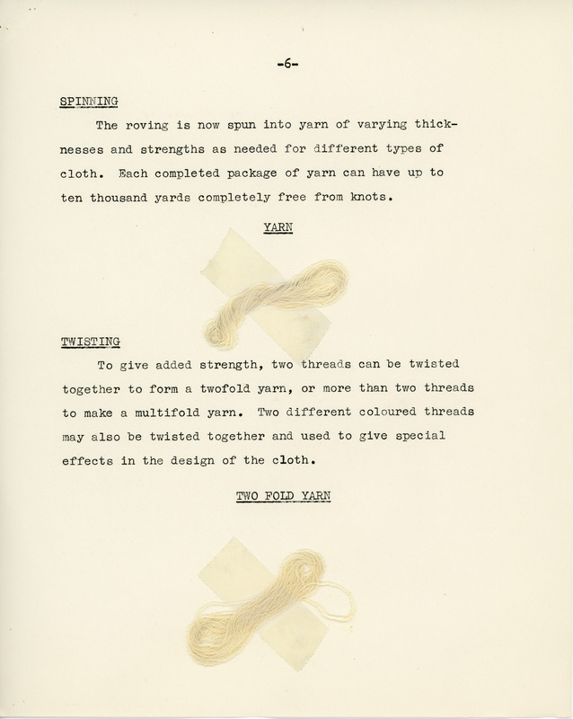 The roving is now spun into yarn of varying thicknesses and strengths as needed for different types of cloth. Each completed package of yarn can have up to ten thousand yards completely free from knots.