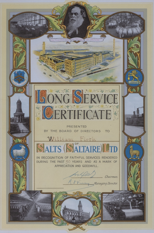 On a more personal level, we have several long-service certificates (some for over 50 years) for working in Salts Mill. Teachers were rewarded differently: George Morell received a wonderful illuminated book after 45 years teaching, and Harriet Byles, Salt Girls High School headteacher for 34 years, got a pony.